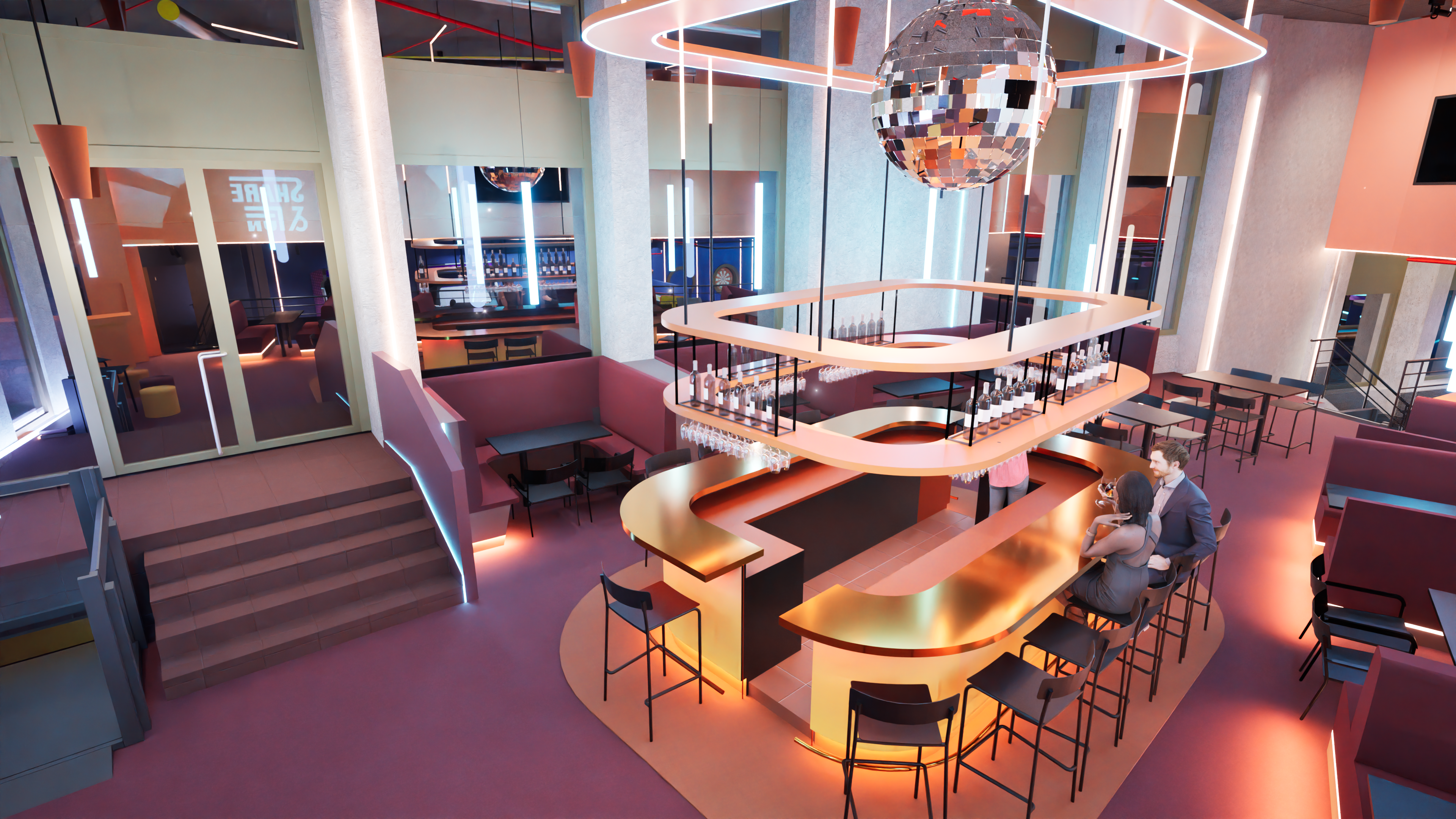Notre espace Resto-Bar immersifde 180m² avec 6m de hauteur sous plafond sera équipé de grands écrans, d’une mini scène pour DJspour une ambiance festive!Et ce n’est pas tout ! 1m plus bas, sur 400m², un vaste choix d’activités ludiques sera proposé :