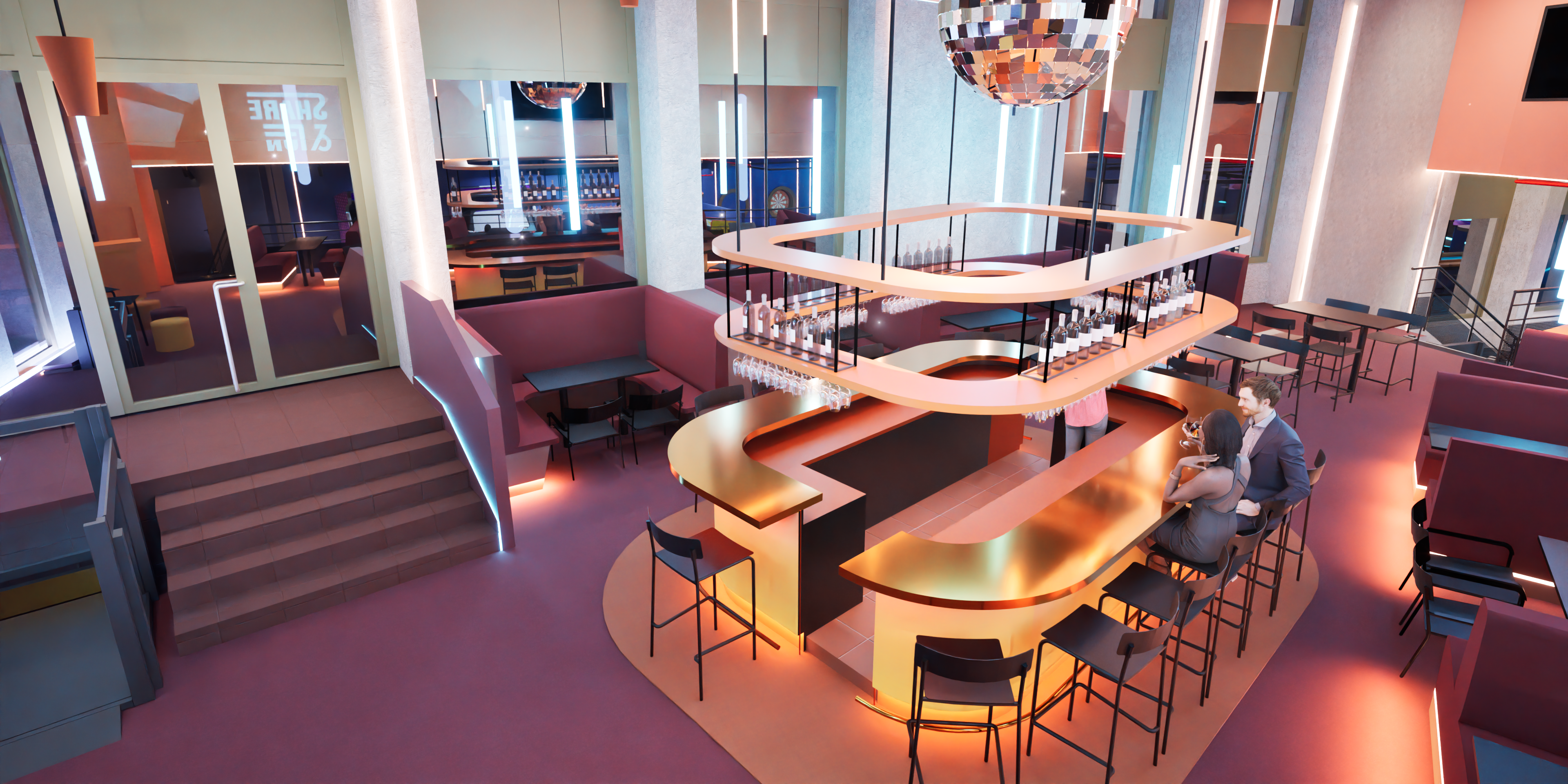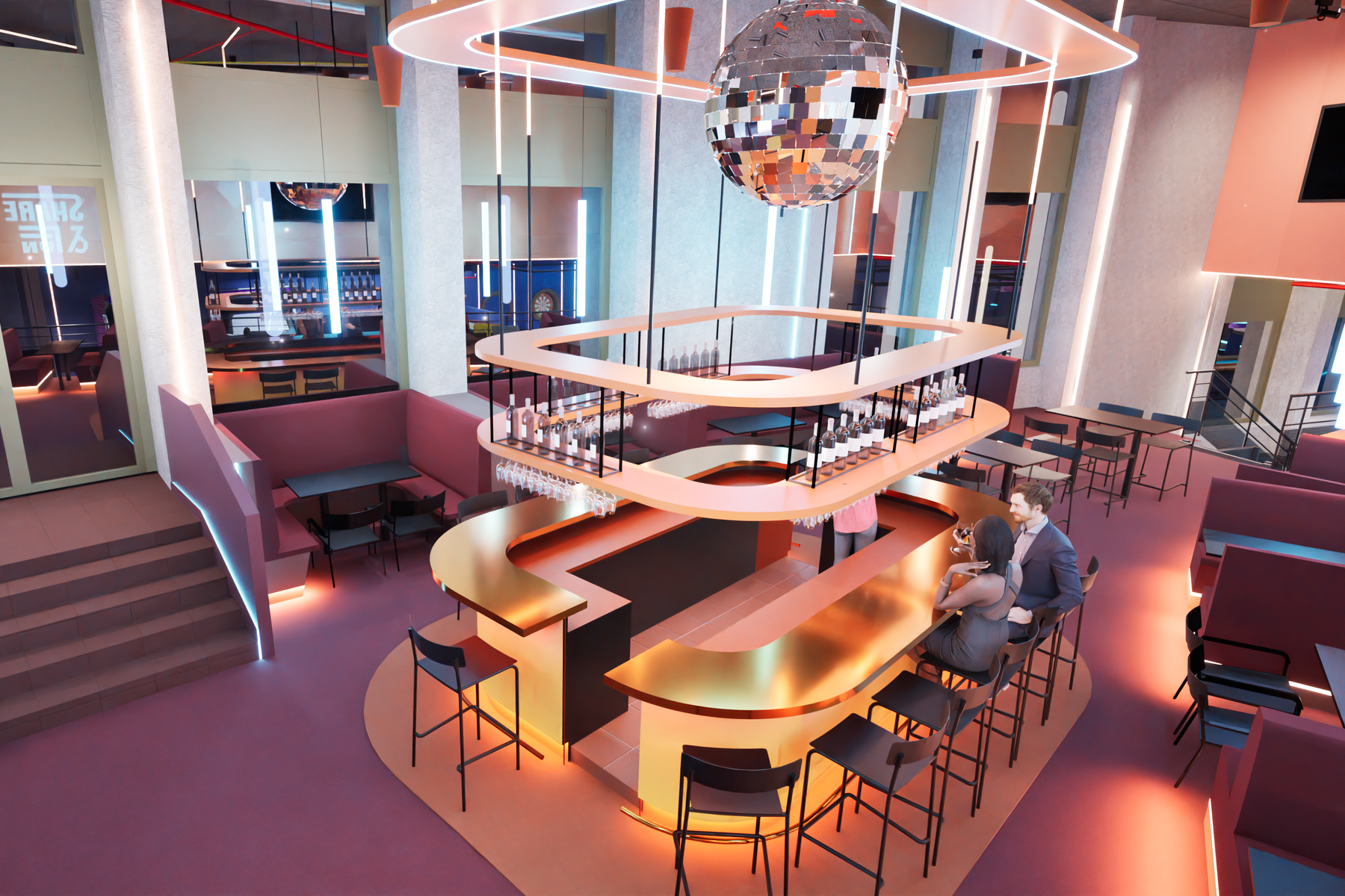 Notre espace Resto-Bar immersifde 180m² avec 6m de hauteur sous plafond sera équipé de grands écrans, d’une mini scène pour DJspour une ambiance festive!Et ce n’est pas tout ! 1m plus bas, sur 400m², un vaste choix d’activités ludiques sera proposé :